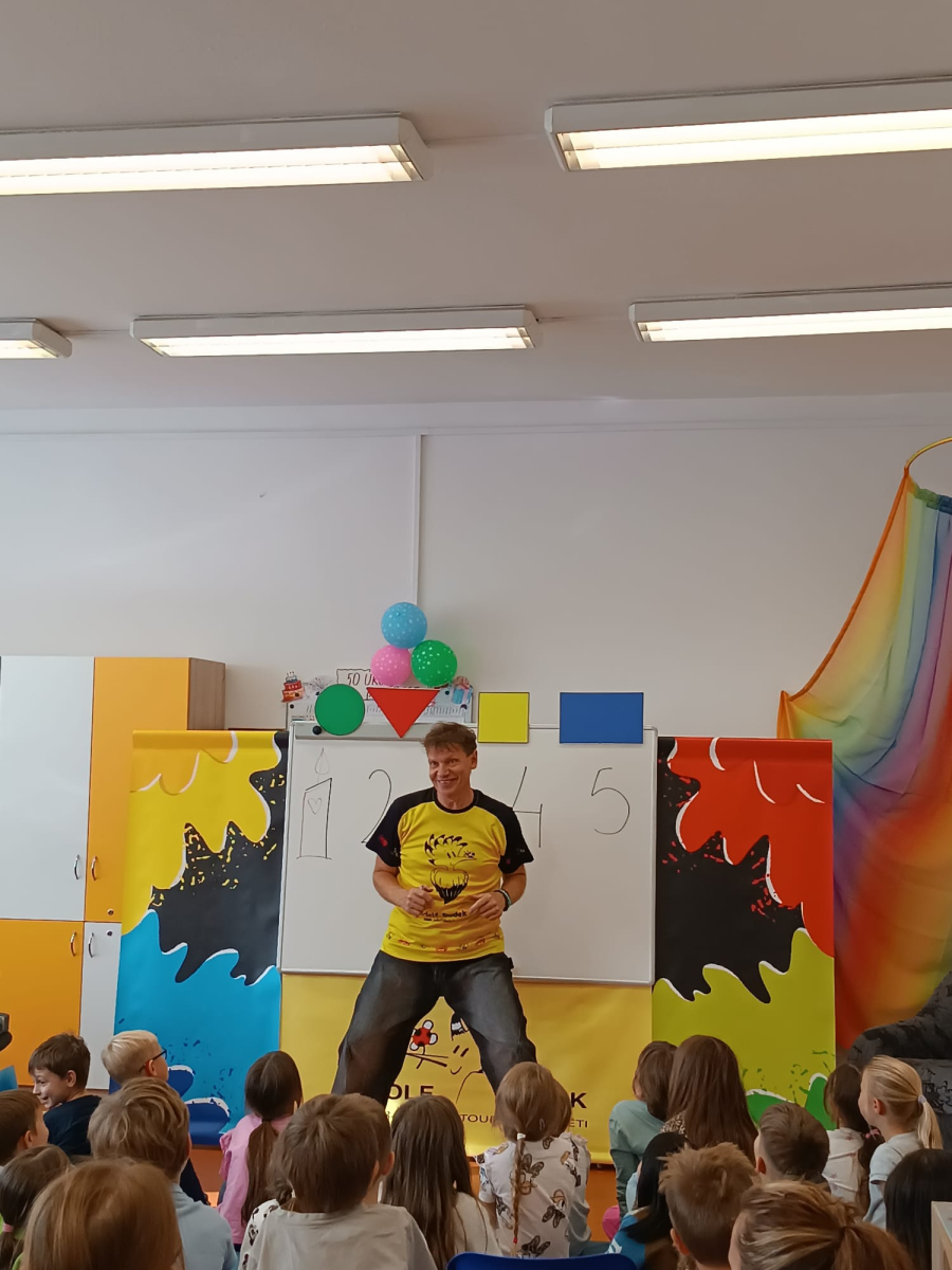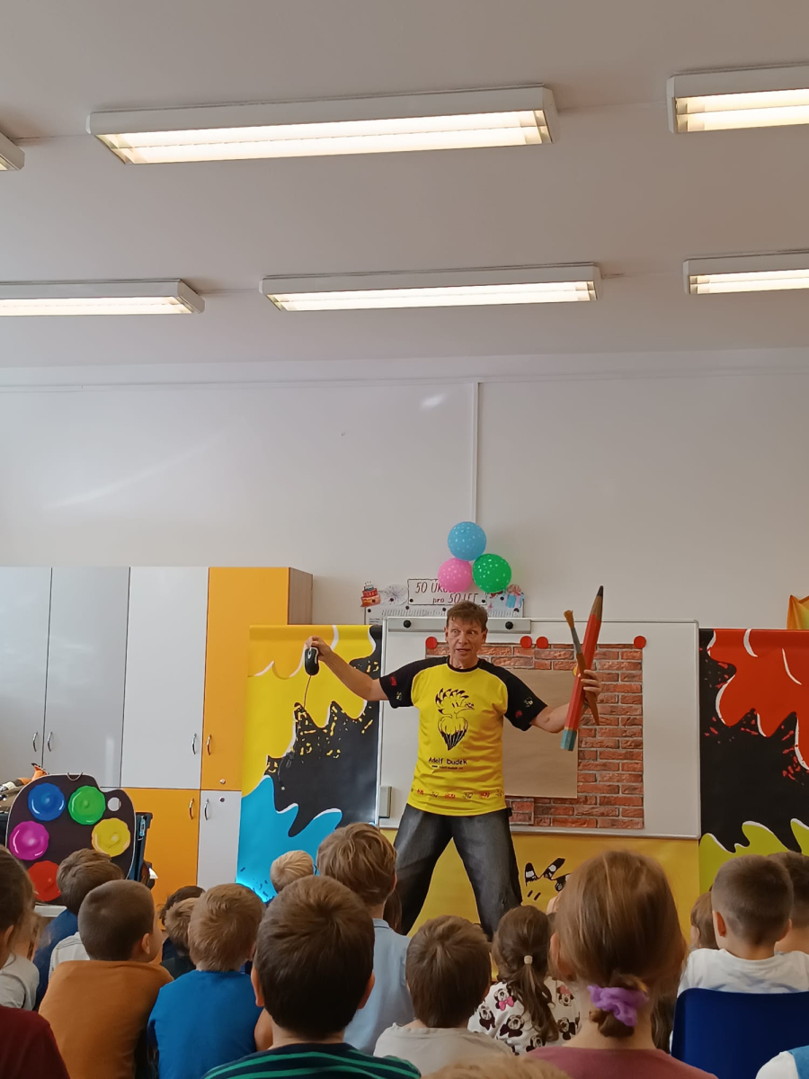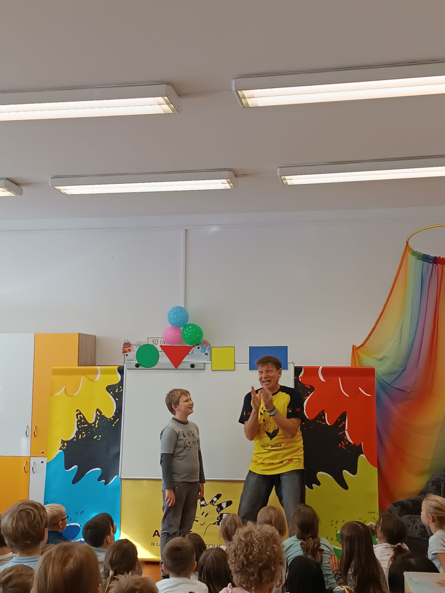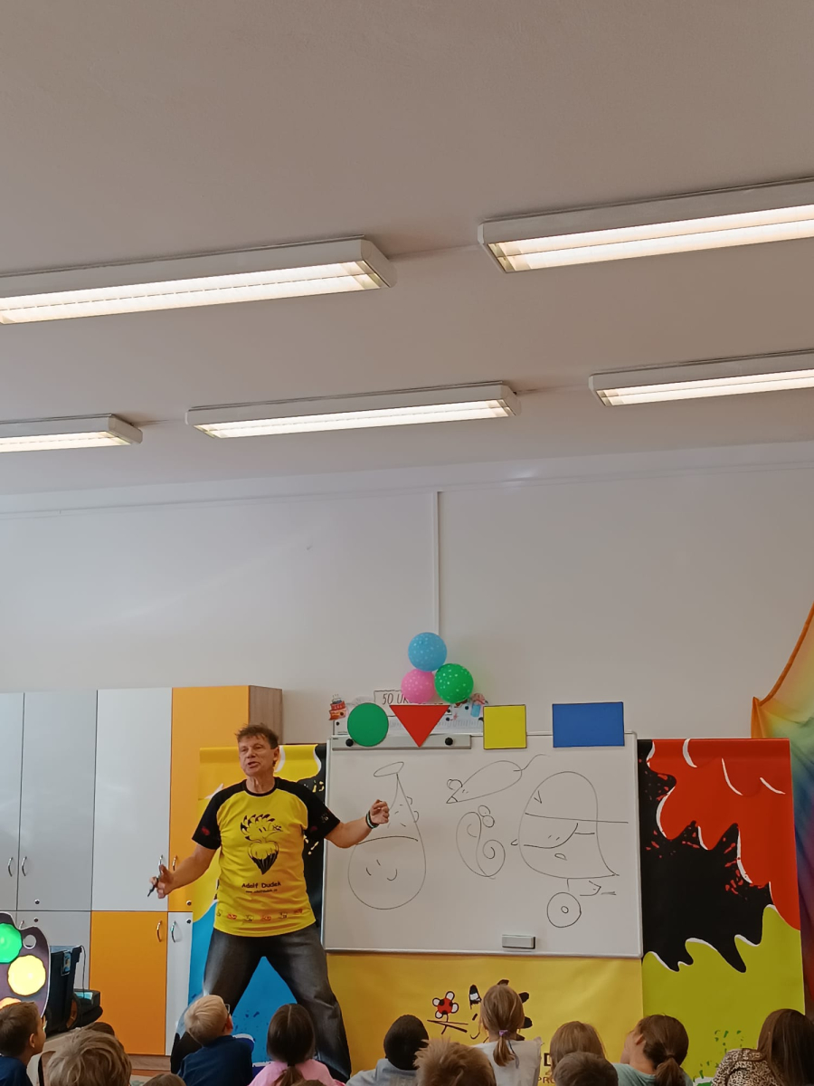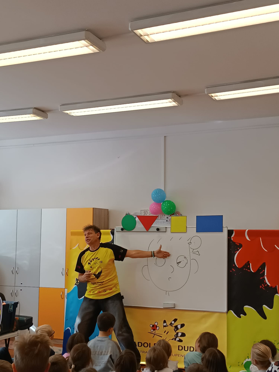 Celé vystoupení bylo doprovázeno humorem a zapojením dětí. Děkujeme panu Dudkovi za báječné odpoledne plné smíchu a kreativity.
