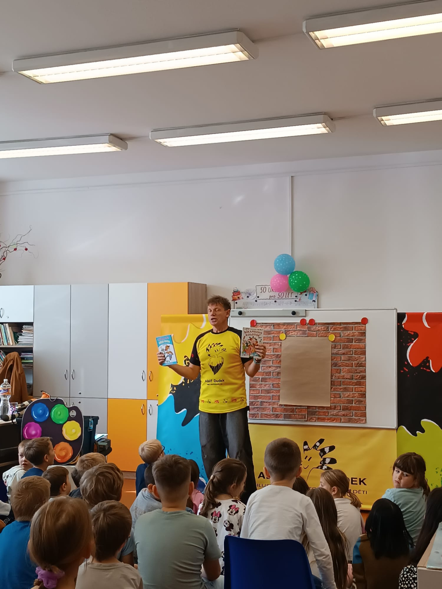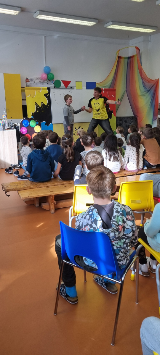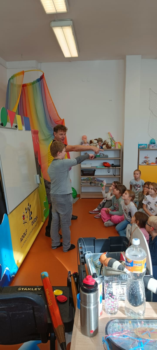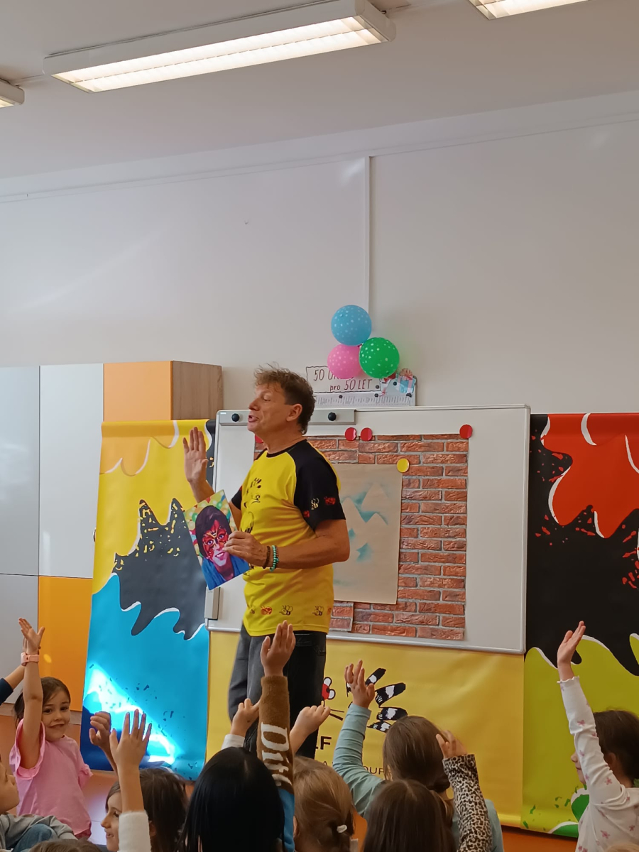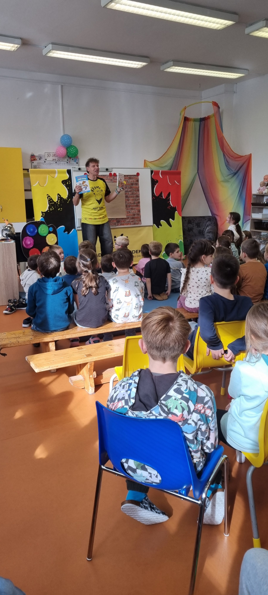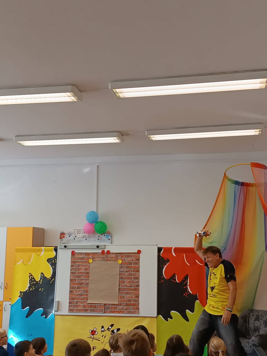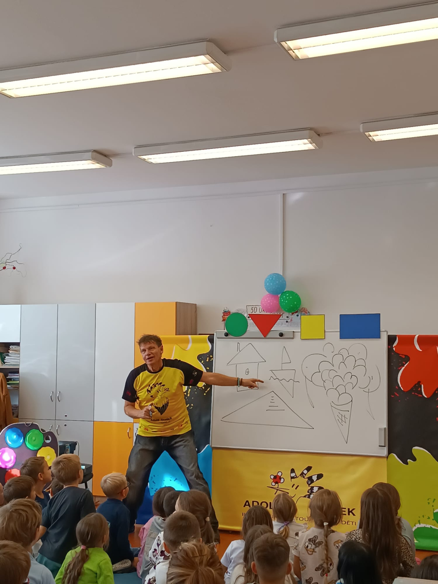 Celé vystoupení bylo doprovázeno humorem a zapojením dětí. Děkujeme panu Dudkovi za báječné odpoledne plné smíchu a kreativity.