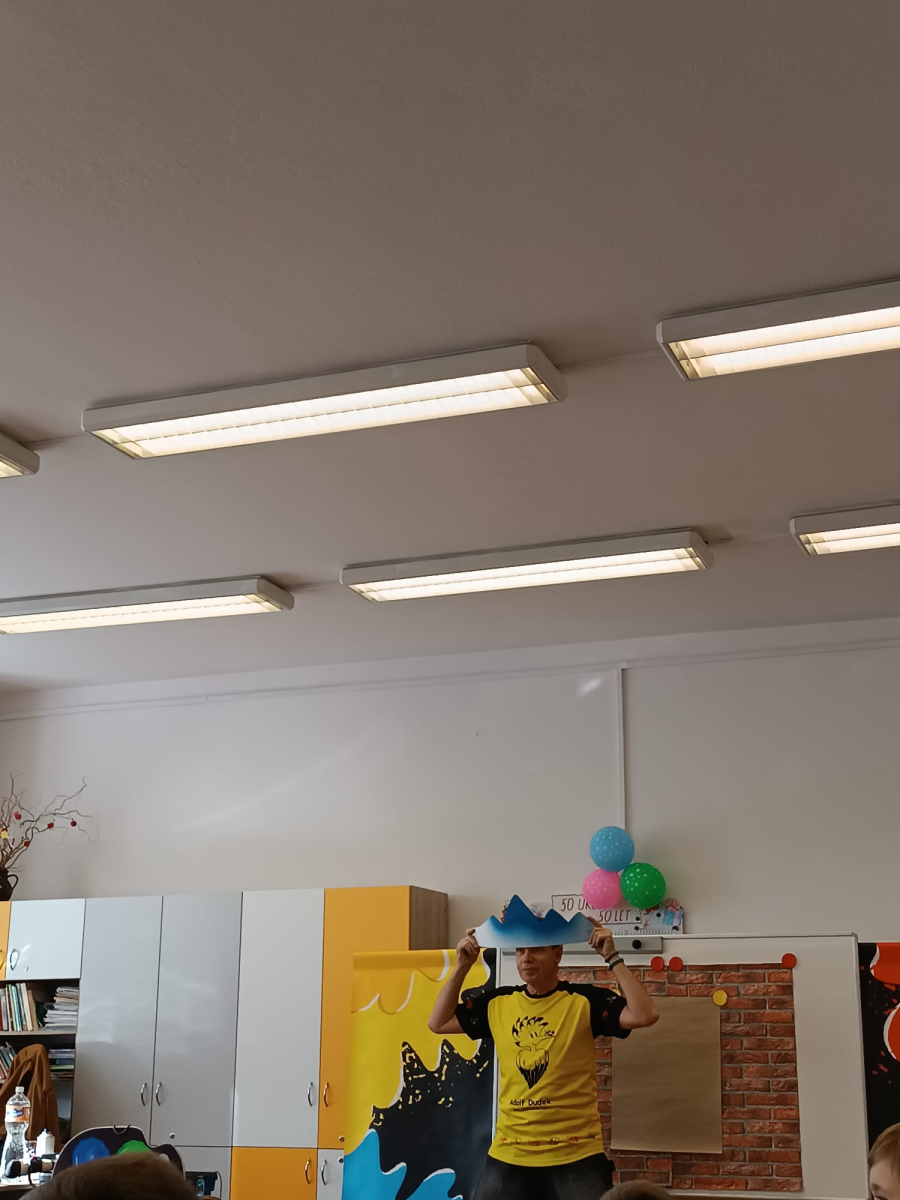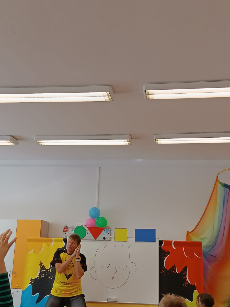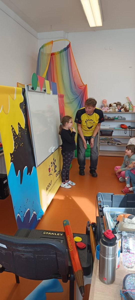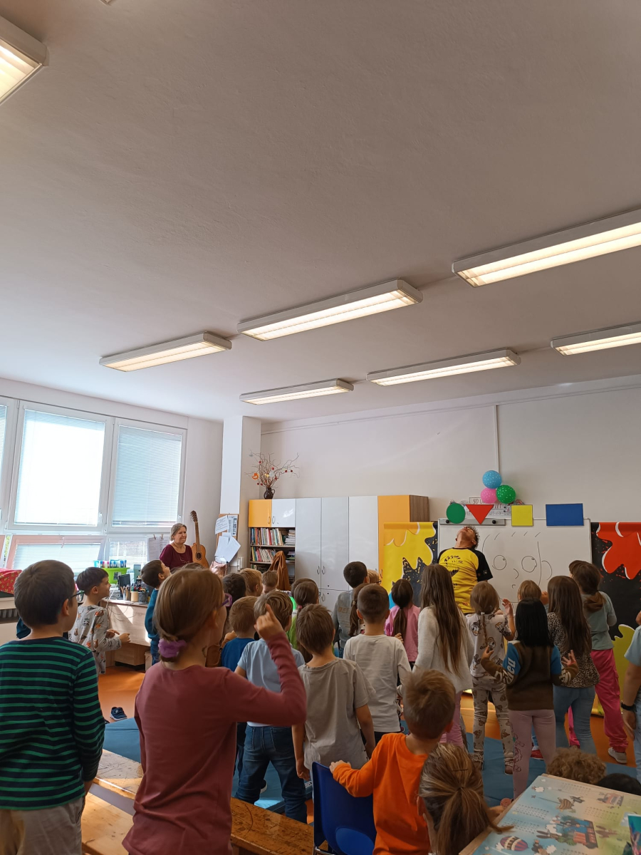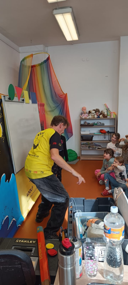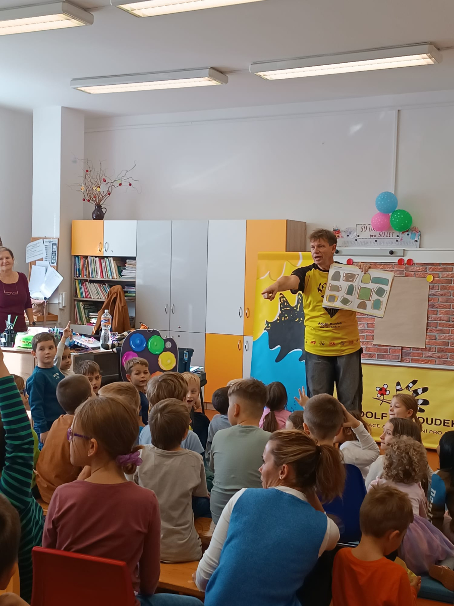 Celé vystoupení bylo doprovázeno humorem a zapojením dětí. Děkujeme panu Dudkovi za báječné odpoledne plné smíchu a kreativity.