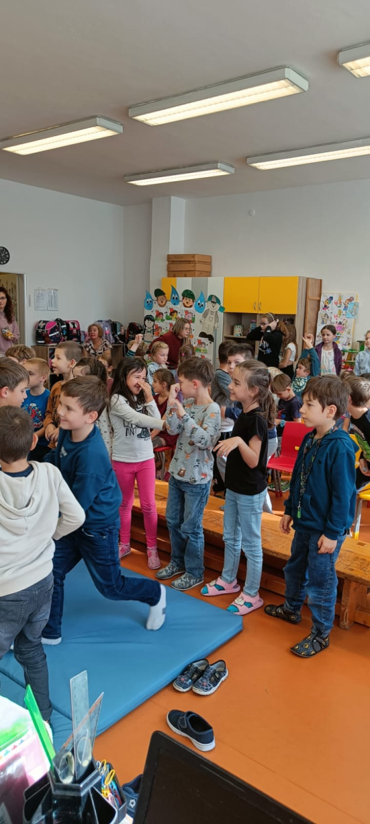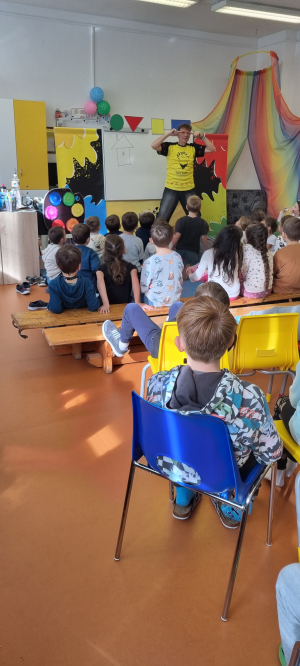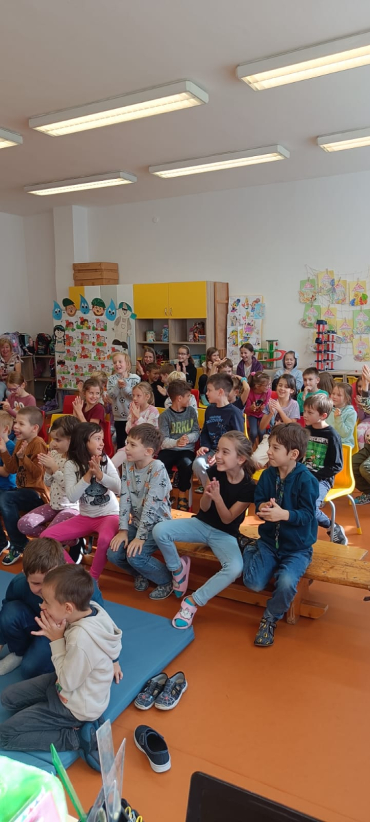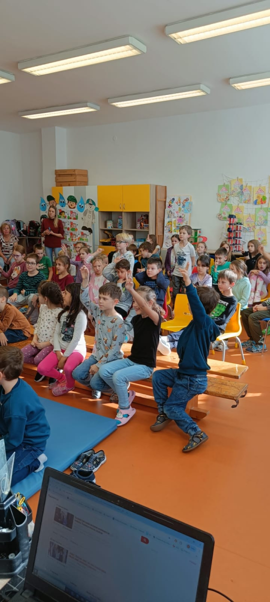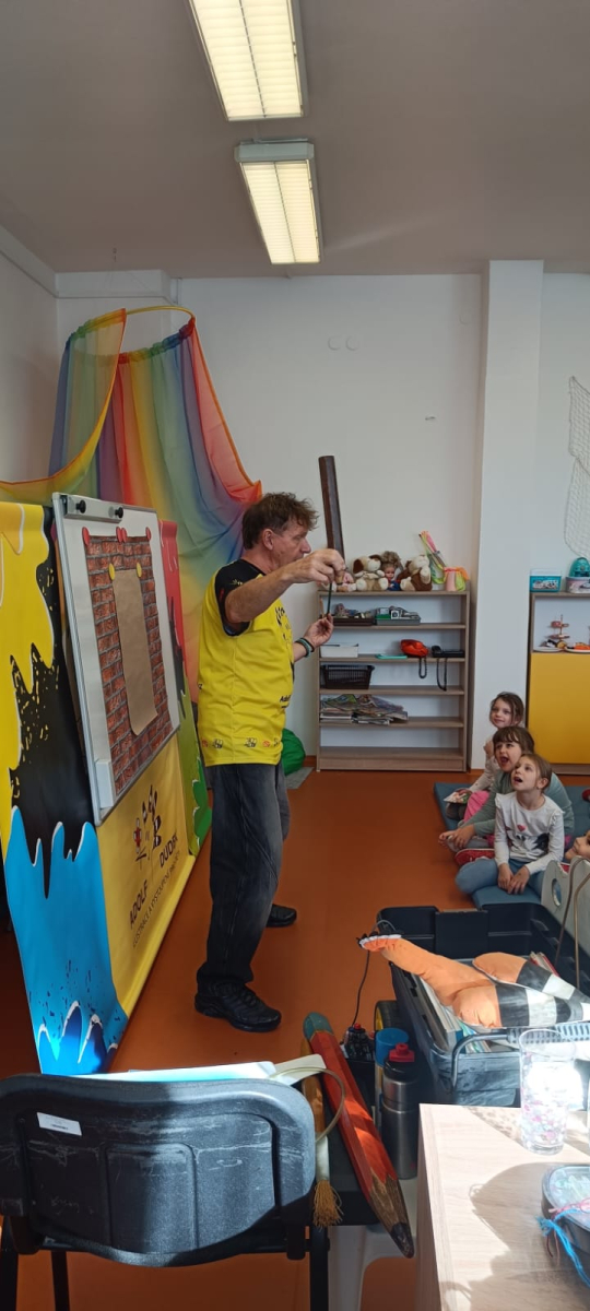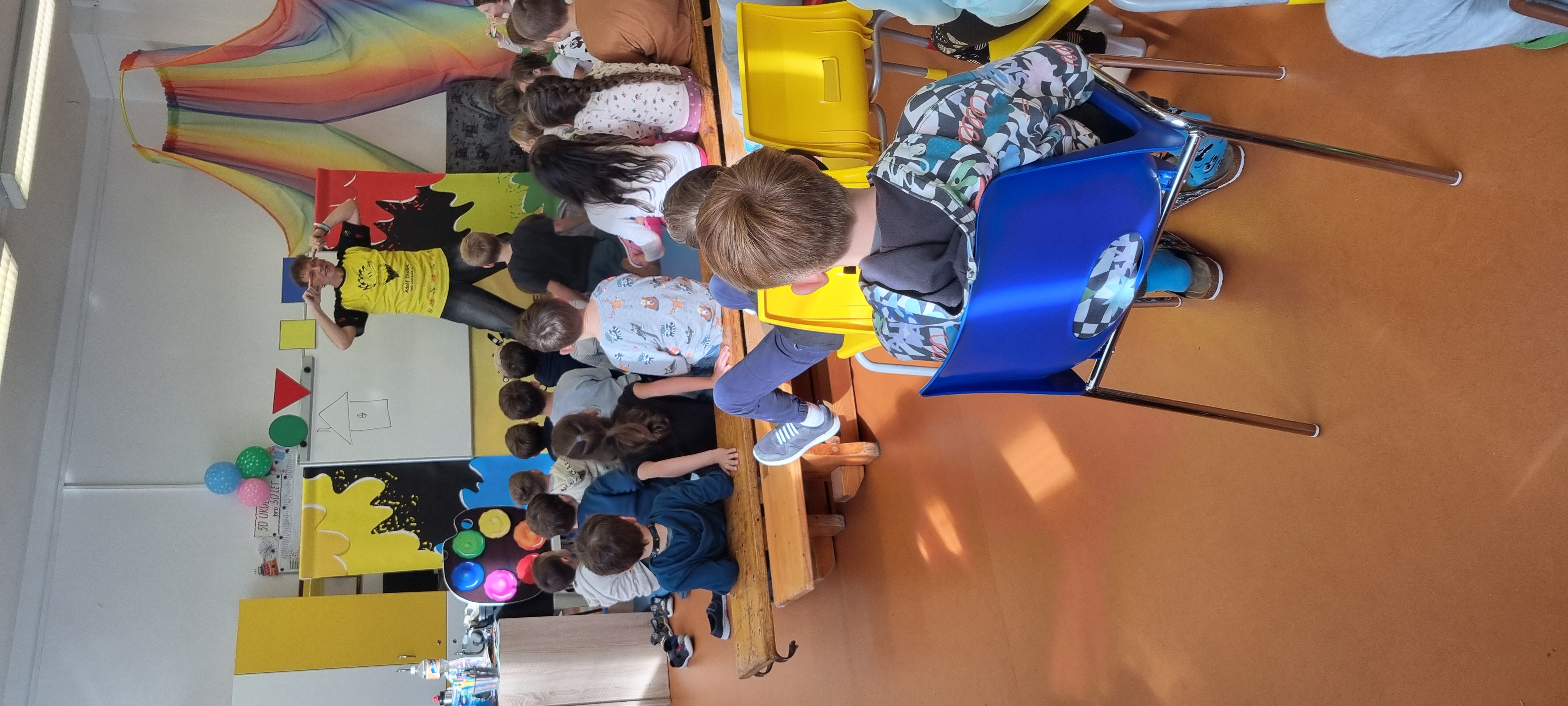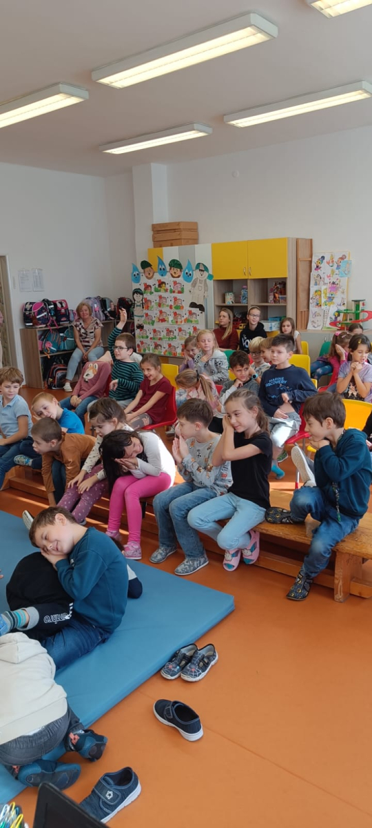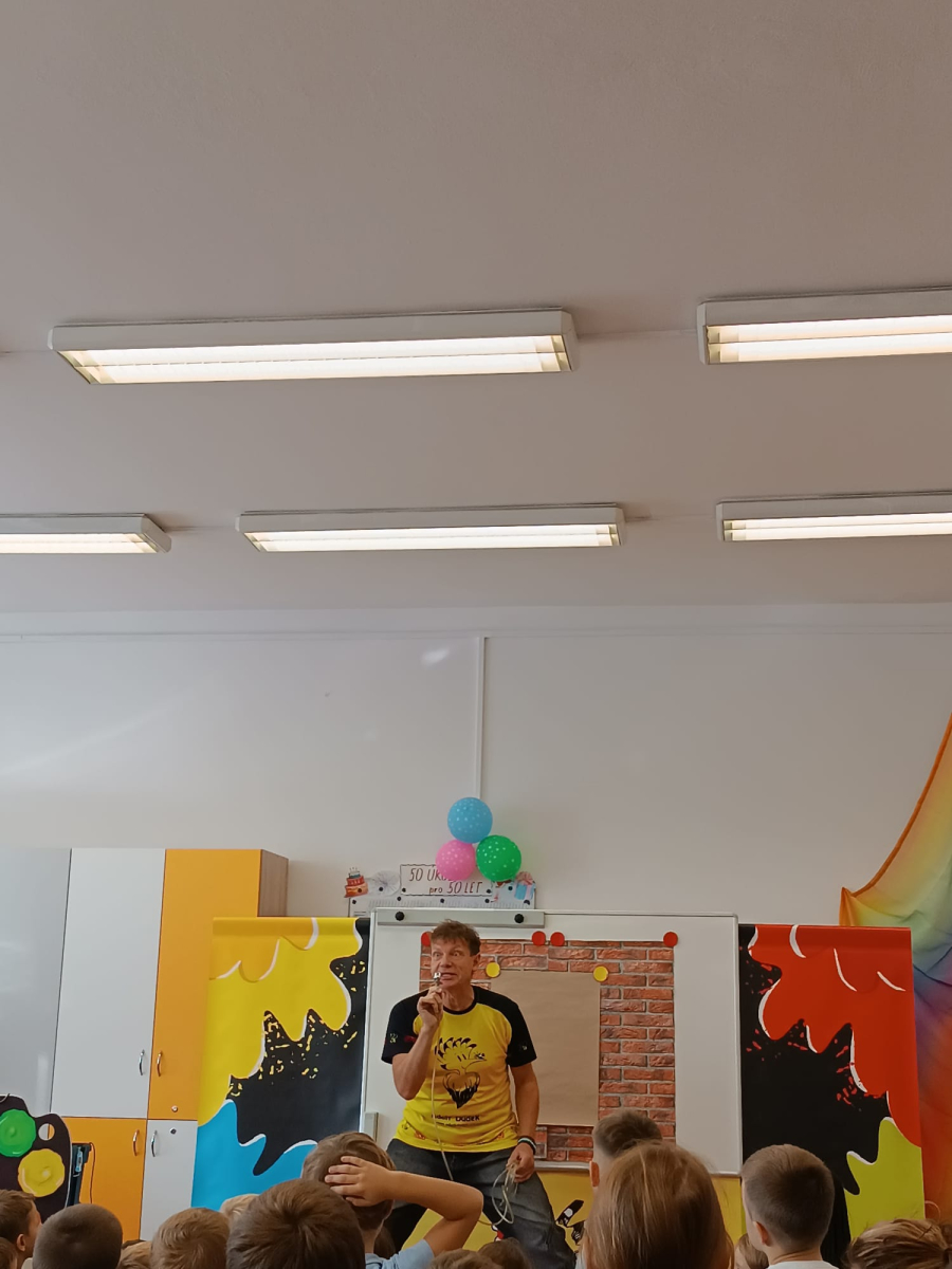 Celé vystoupení bylo doprovázeno humorem a zapojením dětí. Děkujeme panu Dudkovi za báječné odpoledne plné smíchu a kreativity.