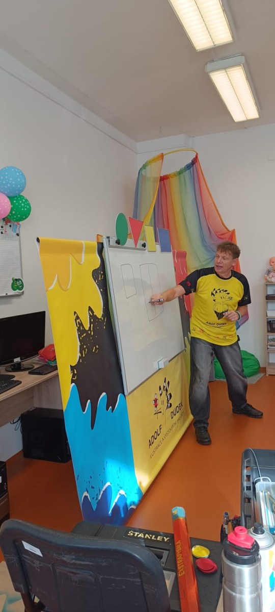 V úterý 21. 10. navštívil naši školní družinu ilustrátor, malíř a bavič Adolf Dudek, jehož kresby můžete znát z dětských knih a časopisů. Pro děti si připravil veselé vystoupení, ve kterém jim ukázal, že kreslit umí opravdu každý.