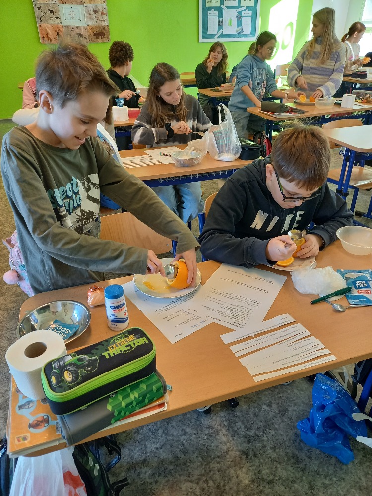 Žáci se s odvahou pustili do dlabání (rozuměj pitvání) pomeranče. Plnili pomeranč směsí soli a sody. Poté obalili svůj výtvor toaletním papírem (rozuměj obvazy).