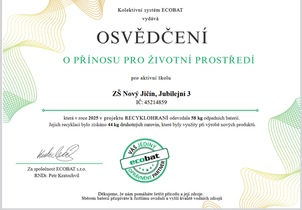 V roce 2025 se naše škola aktivně zapojila do projektu Recyklohraní a společným úsilím žáků, rodičů i zaměstnanců se podařilo shromáždit celkem 58 kg použitých baterií.