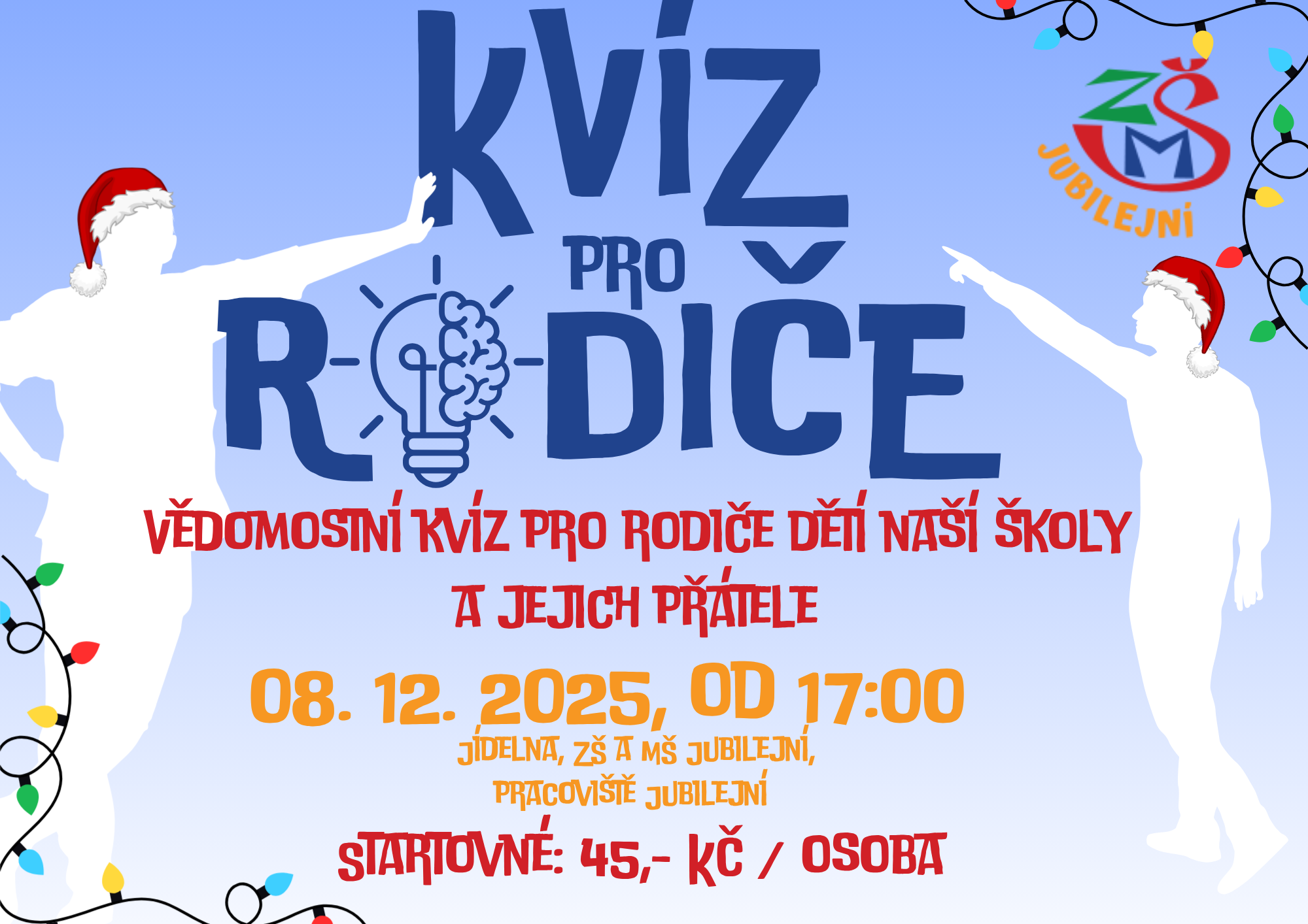 Dne 8. prosince pro Vás na Jubilejní chystáme Rodičovský kvíz. Čeká Vás příjemné podvečerní setkání plné zábavy, svižných otázek a týmové spolupráce. Přijďte si prověřit své znalosti – a třeba i zjistit, zda je těžší spočítat počet poměr másla a hladké mouky při pečení lineckého, nebo odpovědět na otázku z přírodopisu.