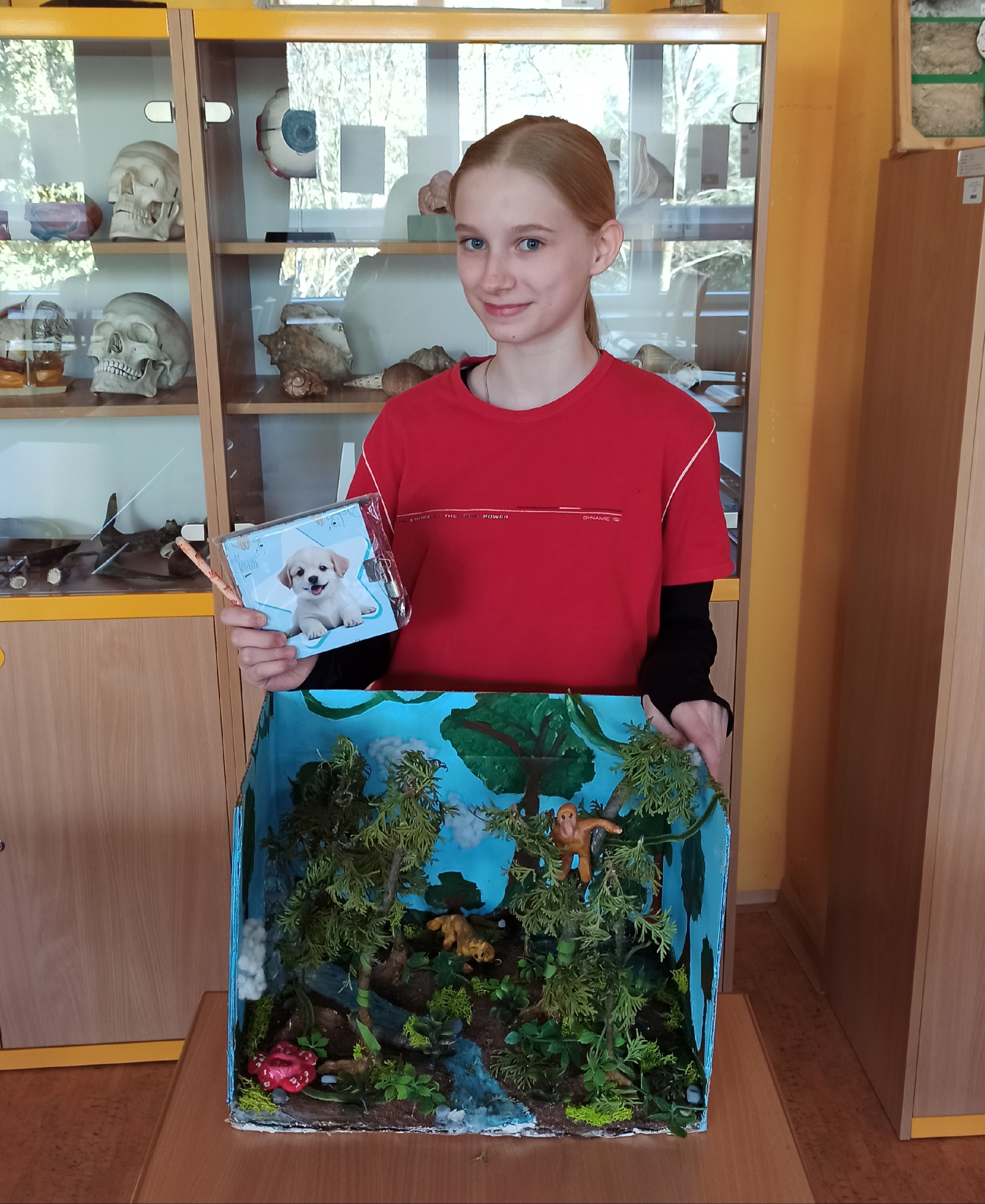 Vstupním úkolem bylo zpracování projektu, vybrala si „Okno do světa“. Amálie jej pojmenovala Deštný prales na Borneu a vytvořila působivé dioráma, jež zaujalo svou originalitou i zpracováním (viz fotografie).