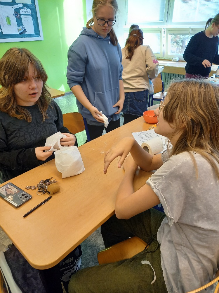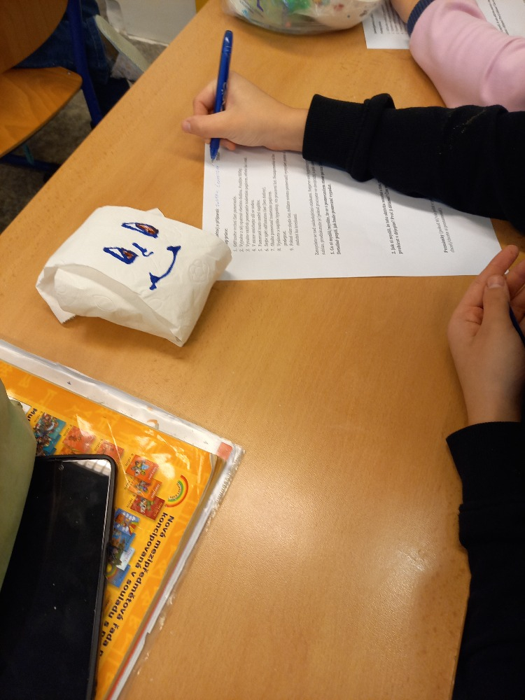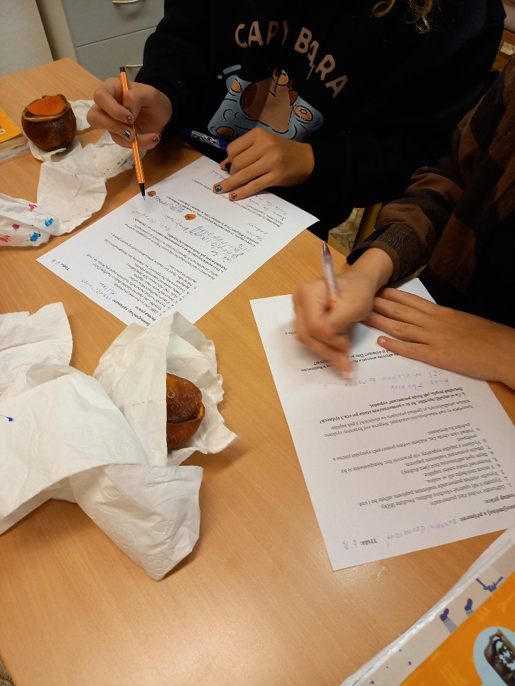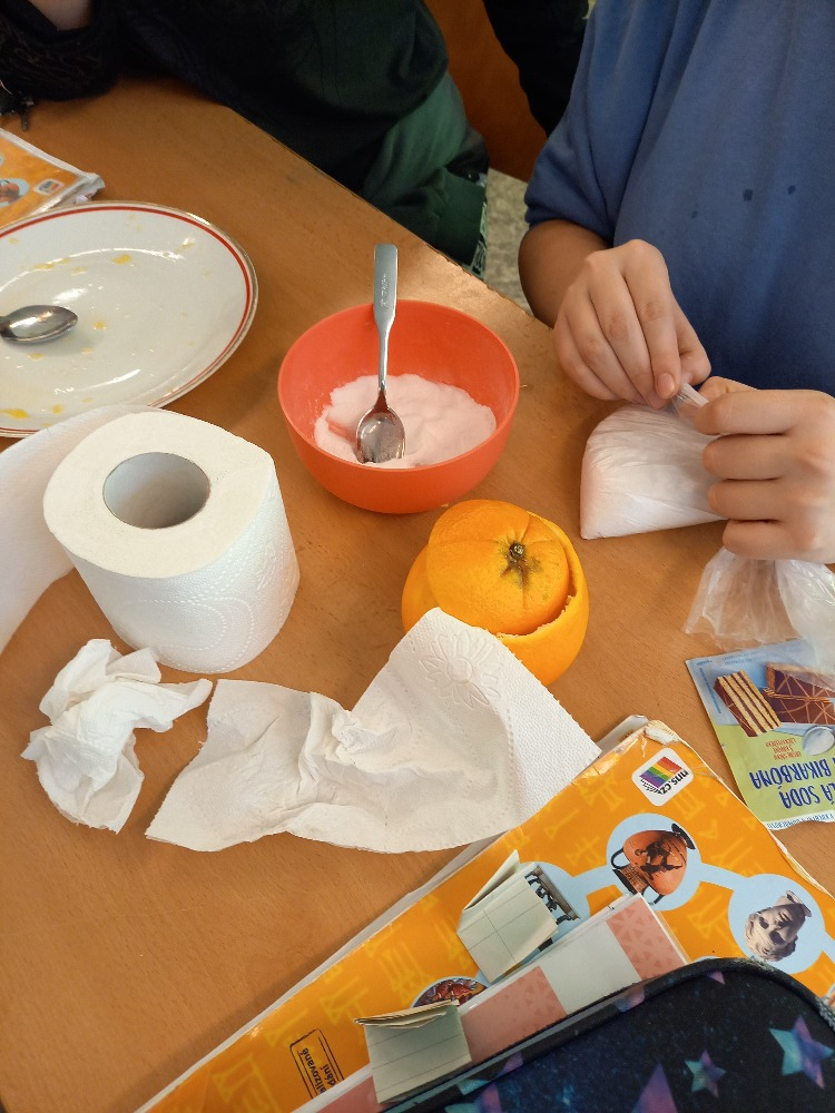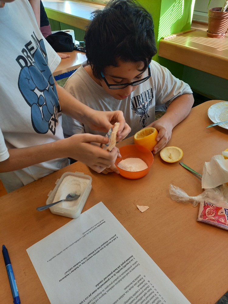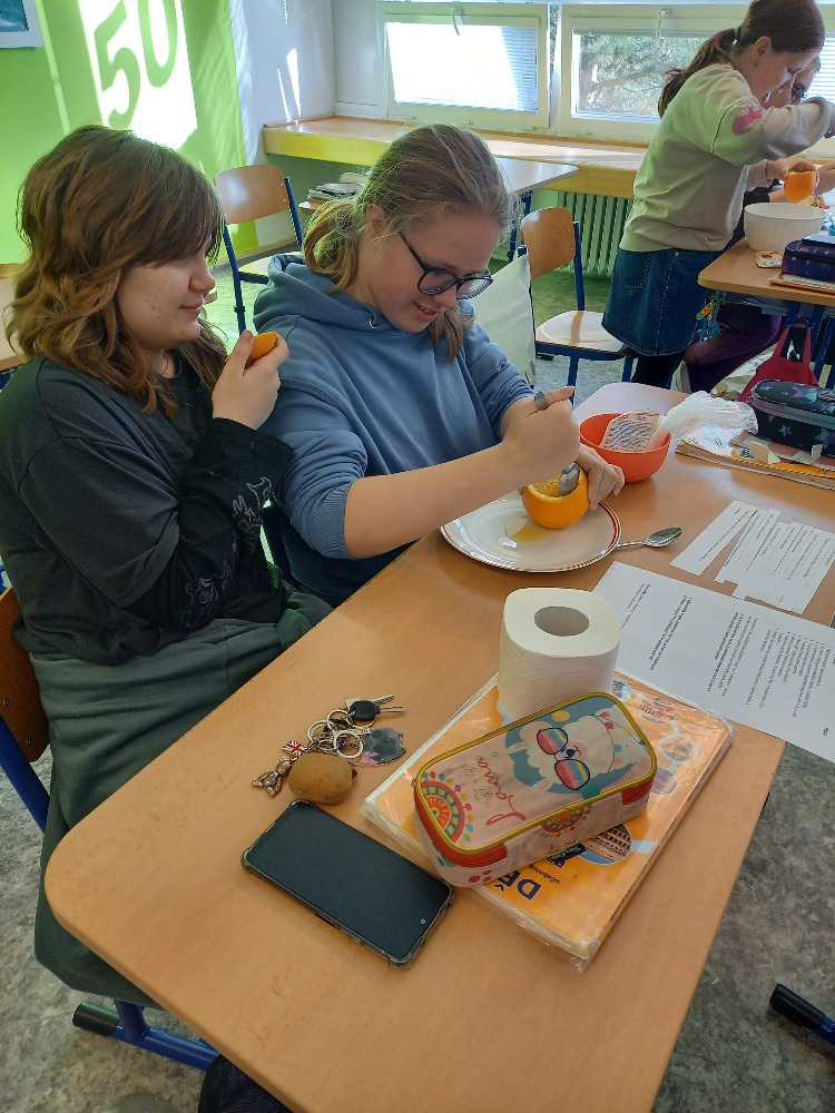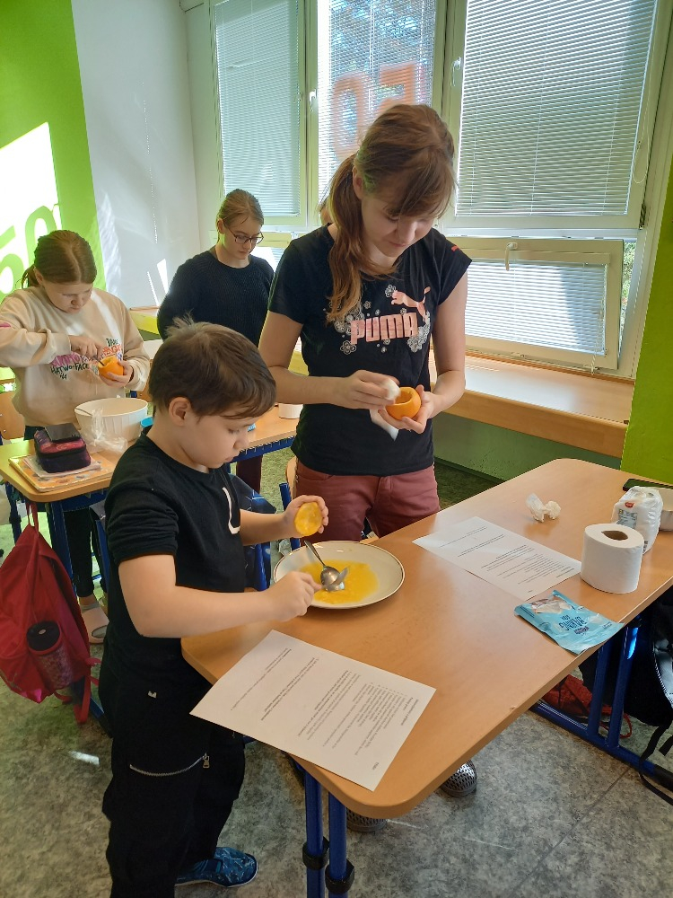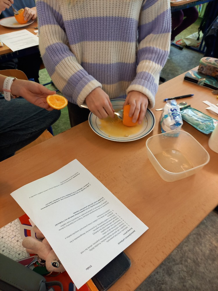 Žáci 6. r. se s odvahou pustili do dlabání (rozuměj pitvání) pomeranče.